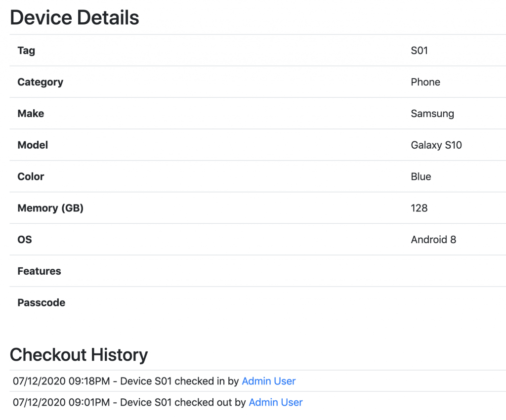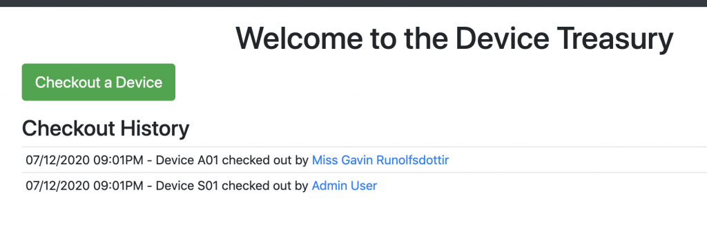 I started by building the the User controller, model, and views. I then added sessions to manage logins and the “remember me” feature. Next came the basics of the Device controller, model, and views. To connect users and devices, I opted to use a has-many-through relationship with a Checkouts model. This is because a user could have many devices checked out and a device could be checked out by many users (not at the same time though). Finally, I built the history functionality by surfacing the details of the Checkouts model.