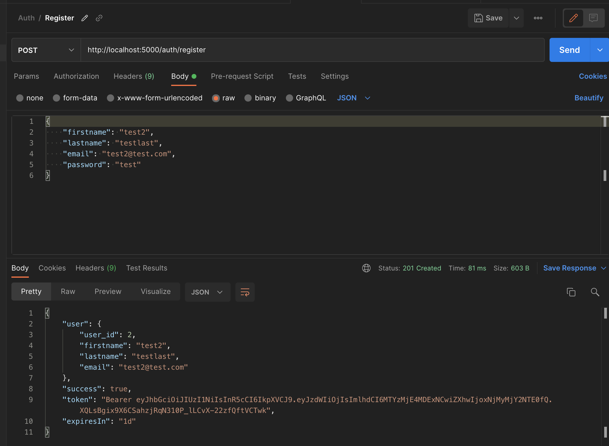 );I then added "/auth/login" and "/auth/register" routes that both generate a JWT (using the jsonwebtoken package) and sent it back in the response. On registration, I used bcrypt to hash the password before storing it in the database. See /server/routes/auth.routes.js and /server/lib/utils.
